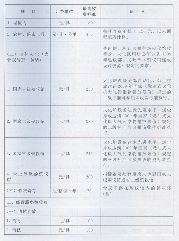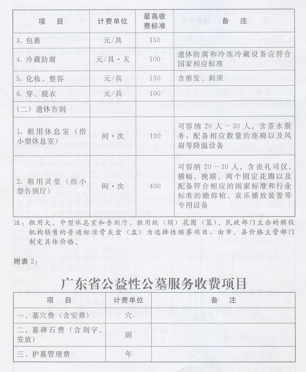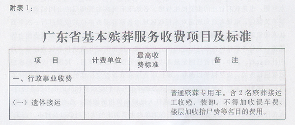 (一)殡葬基本服务:殡葬基本服务项目以不营利为原则。遗体接运、遗体火化、骨灰寄存三项属行政事业性收费项目,其收费仍按我局《关于调整我省殡葬基本服务收费标准的复函》(粤价函〔2006〕661号)规定执行;遗体存放、遗体告别两项按经营性服务项目管理,具体收费标准由各地级以上市政府价格主管部门在省规定的范围内制定(见附表1)。