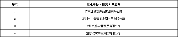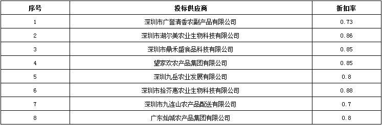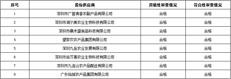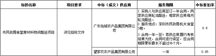 广州高新工程顾问有限公司受深圳市民政局的委托,就市民政局食堂原材料物资配送项目(招标编号:GXZX-19020SZGK)进行国内公开招标,现已完成评标及定标工作。本项目采用“评标和定标实行分离制度”,评标方法采用“综合评分法”,定标方法采用“自定法”。参照《中华人民共和国政府采购法》及其实施条例、《深圳经济特区政府采购条例》等相关法规的相关规定,现将项目评审的相关情况及定标结果公示如下: