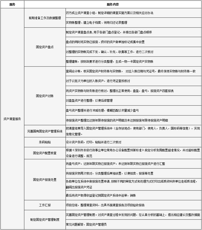 项目内容为深圳市民政局本级固定资产清查,本次清查需全面摸清家底,清理达到年限及盘亏的资产,并按市财政局有关规定、流程进行处置,做到账实相符,修改现有不相适应的固定资产管理制度,完善管理机制,搞高管理水平和效能。