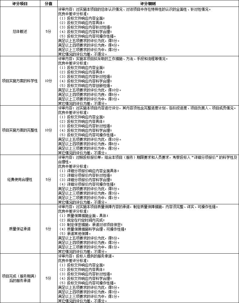 (一)本次评标采用综合评分法。评审小组以招标文件为依据,对投标文件进行评审,对投标人的投标报价、技术部分及综合实力部分内容按百分制打分,其中投标报价分20分,技术分40分,综合实力分40分。