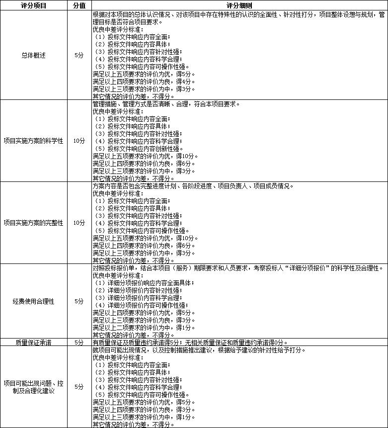 (一)本次评标采用综合评分法。评审小组以招标文件为依据,对投标文件进行评审,对投标人的投标报价、技术部分及综合实力部分内容按百分制打分,其中投标报价分20分,技术分40分,综合实力分40分。