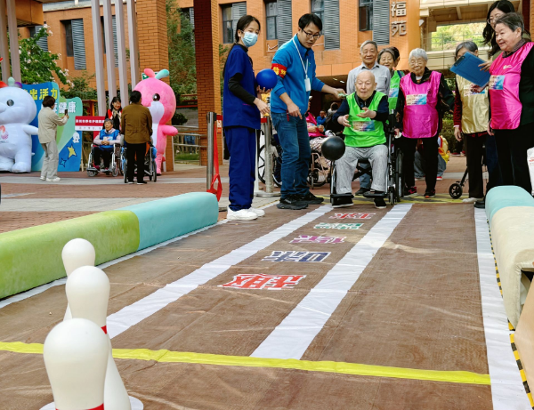 传统项目现场更是热闹非凡,投篮区域,长者们手持篮球,一掷命中,亲属欢呼:“太棒了!再投一个”“加油,慢一点!”的鼓励声彼此起伏;铁人三项赛场上,家属搀扶着长者依次完成规定动作,尽管步伐稍显迟缓,但那份坚持与毅力令人动容;丢沙包区域,家属与长者共同调整角度,齐声喊:“加油!要拿到满分了!”;保龄球作为热门项目,每当有长者投掷保龄球获得好成绩,家属们都会欢呼鼓掌,温馨的互动让赛场充满家的温暖。