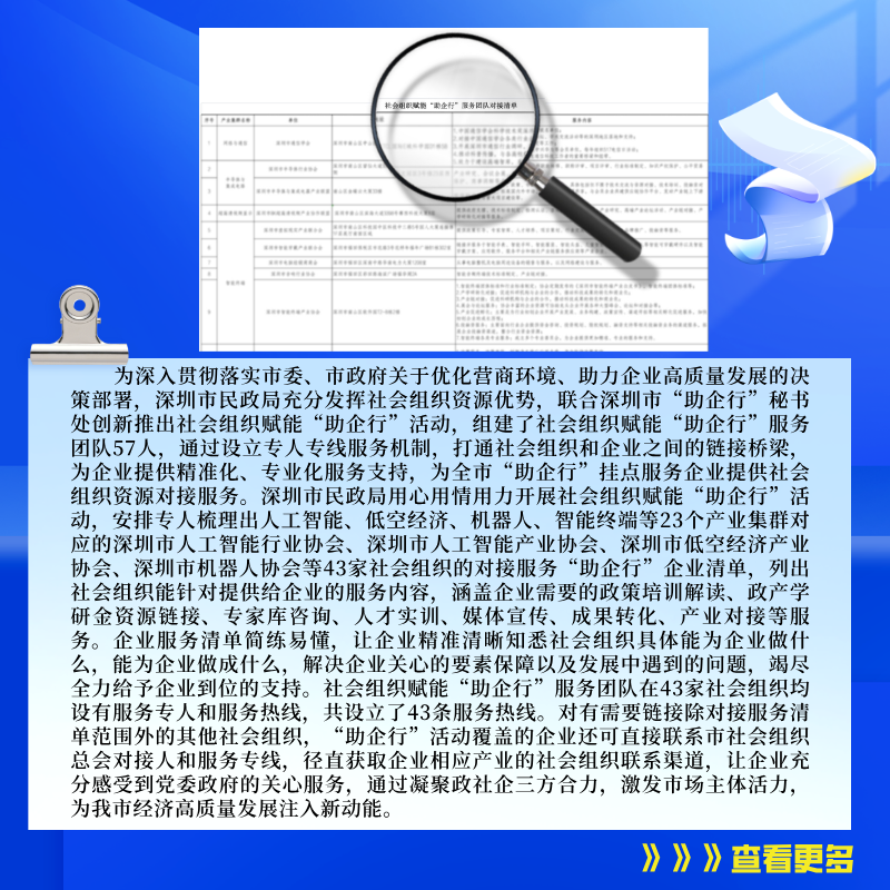 通过做好民政工作,紧紧围绕高质量发展主线,用“搭平台、树品牌、优服务”,支持和引导行业协会更大发挥作用,助力企业做优做强,营造更优新环境,为深圳高质量发展注入源源不断的新动力新动能,助力加快打造更具全球影响力的经济中心城市和现代化国际大都市,奋力在推进中国式现代化的伟大实践中走在前列、勇当尖兵。